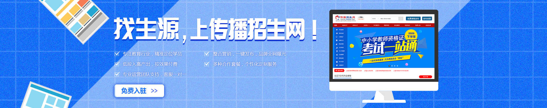 傳播招生網(wǎng)最專注教育行業(yè)網(wǎng)絡(luò)招生的發(fā)展。目前知識更新越來越快,終身教育成為時代的主流,選擇合適的培訓(xùn)機構(gòu)成為大家培訓(xùn)充電最首要的問題,傳統(tǒng)媒體信息的局限性及培訓(xùn)機構(gòu)的宣傳成本嚴重制約了培訓(xùn)提供者與培訓(xùn)需求者之間的雙向交流,網(wǎng)絡(luò)宣傳途徑變得越來越受歡迎。